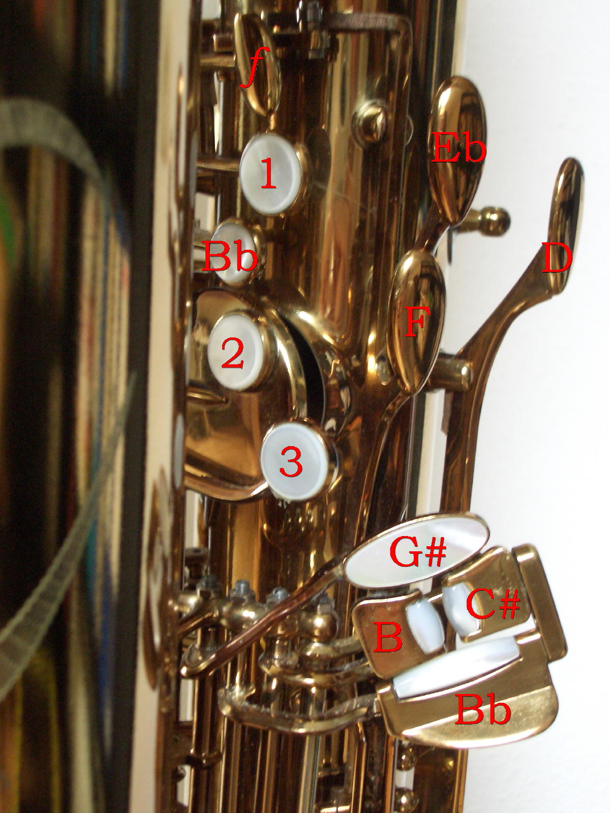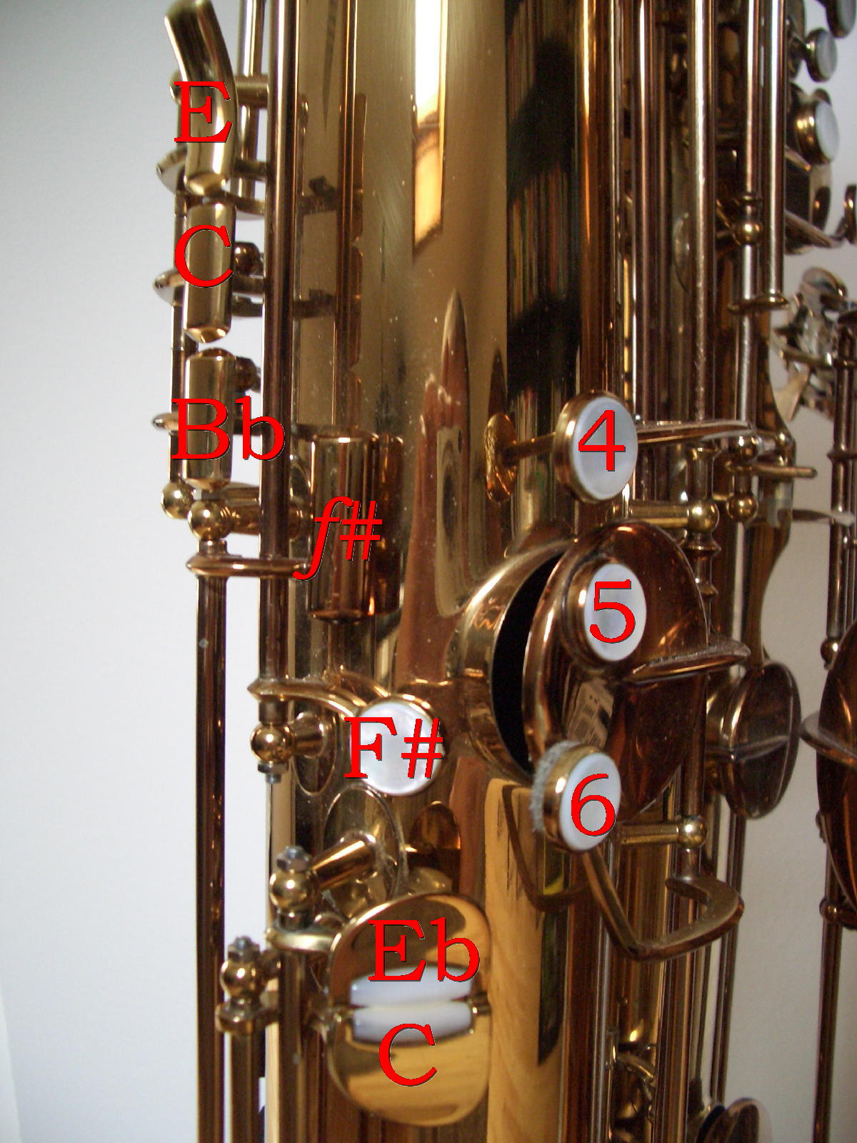 For mechanical reasons, keys 2 and 3 as well as 5 and 6 are linked, so the heavily used altissimo fork fingerings 1-3 etc. are not available on the Tubax. In compensation, there is the altissimo key A which provides totally new fingering options.